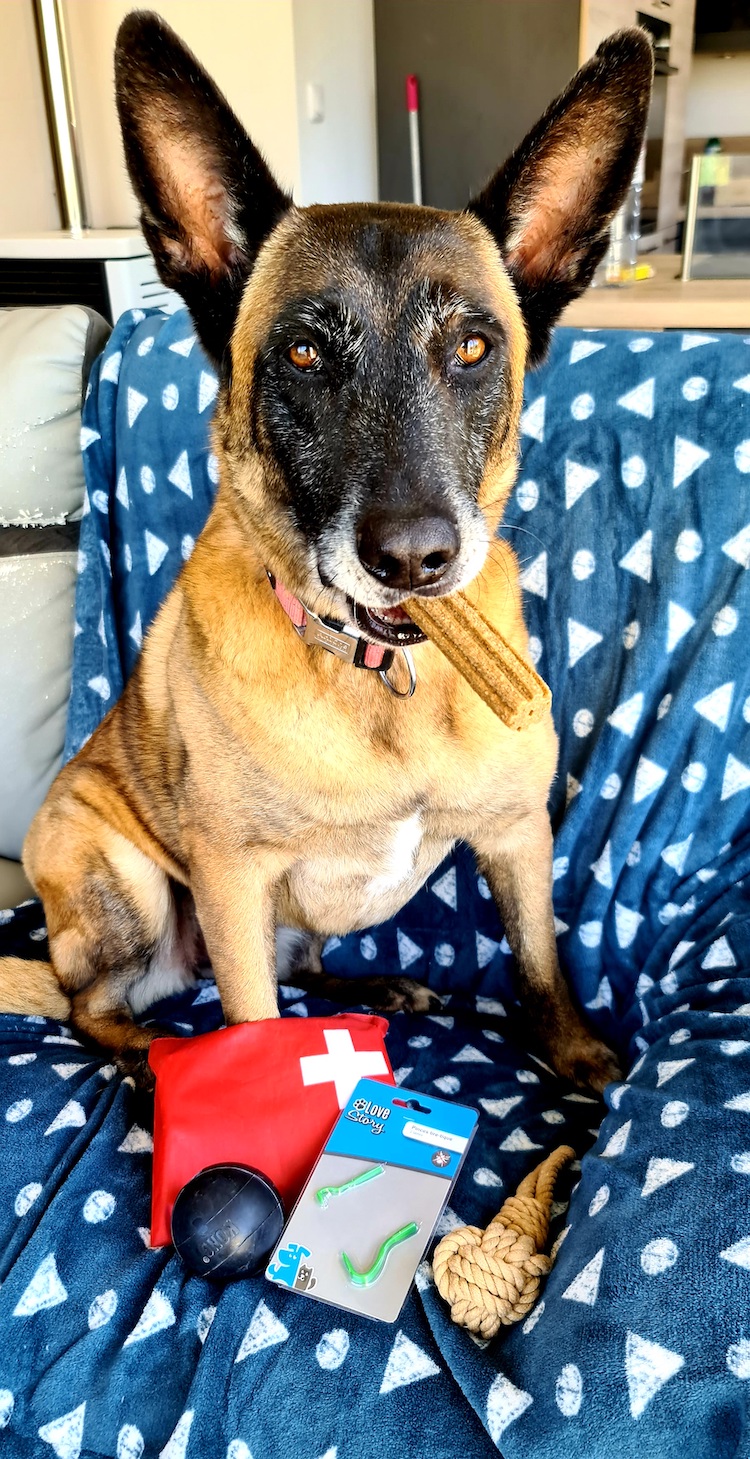 Comme tous les maîtres qui ont accepté de témoigner dans le cadre de l'anniversaire des 10 ans de Bulle Bleue, la compagnie d'assurance santé animale les a récompensés, ou plutôt leurs compagnons, en leur envoyant en cadeau quelques jouets, accessoires et friandises.