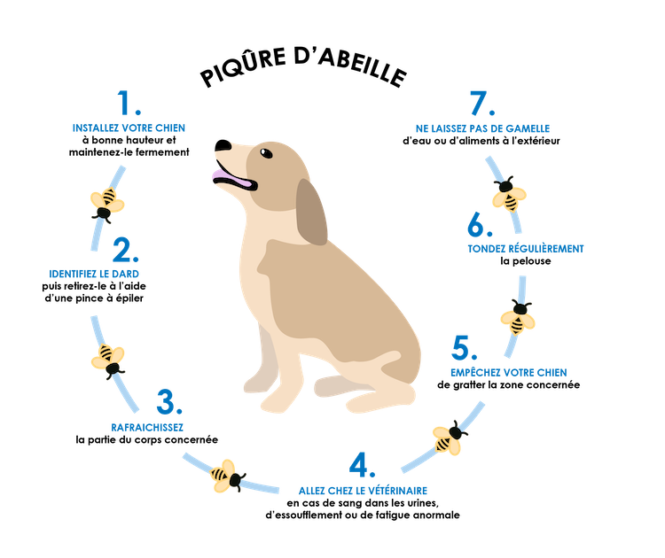 Pris de panique et face parfois à l'excitation du chien voire à la douleur qu'il ressent il n'est pas aisé de reconnaître par exemple une piqûre d'abeille qui se présente sous forme d'un cercle avec un contour rouge avec le dard encore généralement présent et de faire la différence avec une piqûre de guêpe : l'inflammation s'accompagne souvent de démangeaisons. Le vétérinaire sera à même d'identifier l'insecte responsable ; ce pourrait être aussi une piqûre de taon, entre autres.